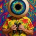 The artwork is a black and white illustration featuring a surreal, dreamlike composition. The central figure is a large object with an eye on its back, wearing a crown. Various objects and figures are scattered throughout the image, including clocks with their hands pointing at different times, a descending missile, abstract patterns resembling fingerprints, and a skeleton in a standing pose with a prominent x-rayed spine, highlighted with a magnifying glass for the feet.